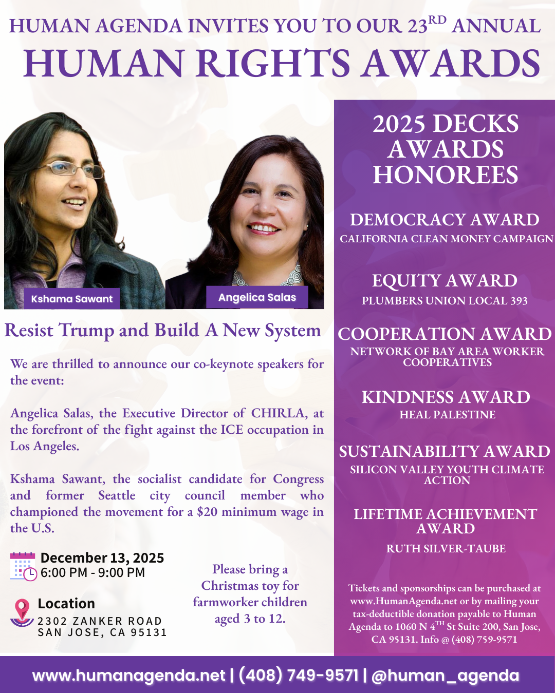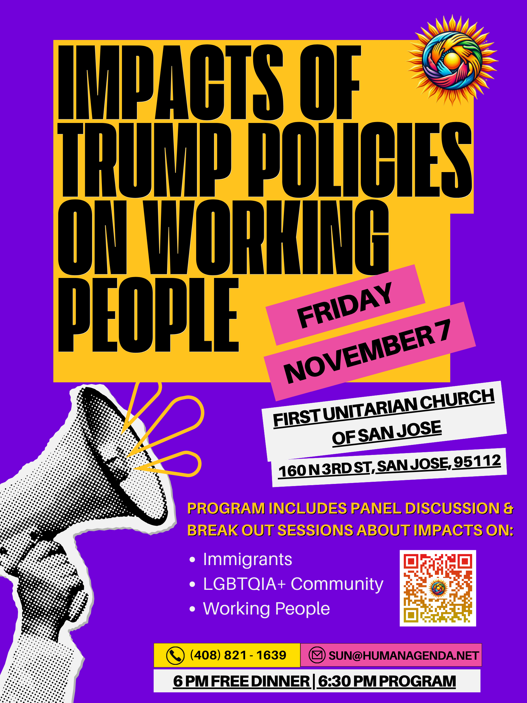 Human Agenda invites you to a special convening to come and hear from different sectors of the community who will explain what is at stake under the Trump Presidency and what we can do to mutually support each other. Speakers will address what is at stake for immigrants, the environment, peace, democracy, criminal justice, accurate information, tariffs, public education, health care, the labor movement, human rights, and for women, Muslims, African Americans, Latinos, and Asian Americans. We will have a much better idea of what is at stake following presidential actions on his first days in office.